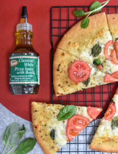 - Spread Beano’s Classical White Pizza Sauce on top of the shell, covering the entire shell