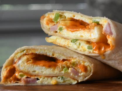 - While the tortilla is crisping and the omelet is facing up, salt and pepper to taste and drizzle Beano’s Roasted Chipotle sauce.