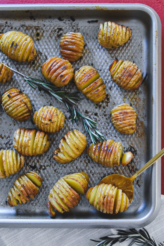 Delicious crispy rosemary roasted potatoes. Made with Yukon gold potatoes, butter, our Olive Oil Sub Dressing, rosemary, garlic, plenty of flaky sea salt and black pepper. What’s the secret to the crispness and flavor? Thinly slicing the potatoes into a “Hasselback” and roasting them at high heat. The potatoes come out of the oven perfectly crisp, with just the hint of rosemary.
