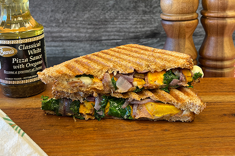 This isn’t your average grilled cheese. We added sweet potatoes roasted with Beano’s White Pizza Sauce with Oregano, caramelized onions, and kale to make a tasty twist on the classic grilled cheese.