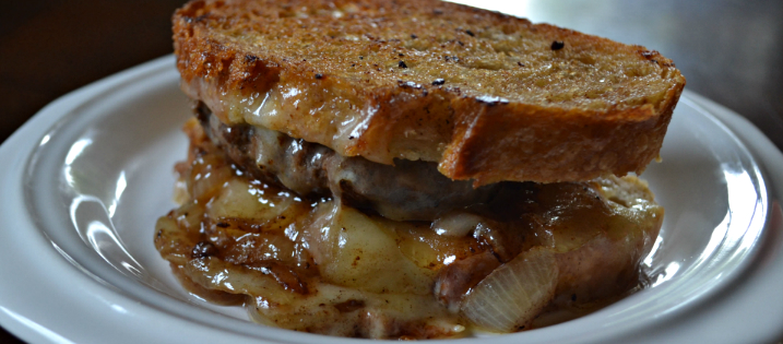 - With the bread still in the pan, add a slice of cheese, the patty, the onions, and top with another slice of cheese